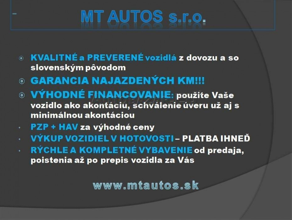 TK a EK PLATNÁ DO 09/2027. MOTORICKY BEZ ZÁVAD!!! INTERIÉR ZACHOVALÝ! MOŽNOSŤ KÚPY NA SPLÁTKY S 0% AKONTÁCIOU! NEMÁTE HOTOVOSŤ ?? VYKUPIME VAŠE STARE VOZIDLO ALEBO HO POUŽITE AKO AKONTÁCIU PRI KUPE NA SPLATKY! V PRÍPADE ÚVERU-LEASINGU MOŽNÁ ZĽAVA AŽ DO VÝŠKY 500 EUR!!GARANCIA PôVODU VOZIDLA AJ NAJAZDENÝCH KILOMETROV.