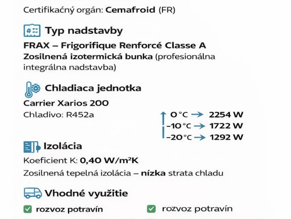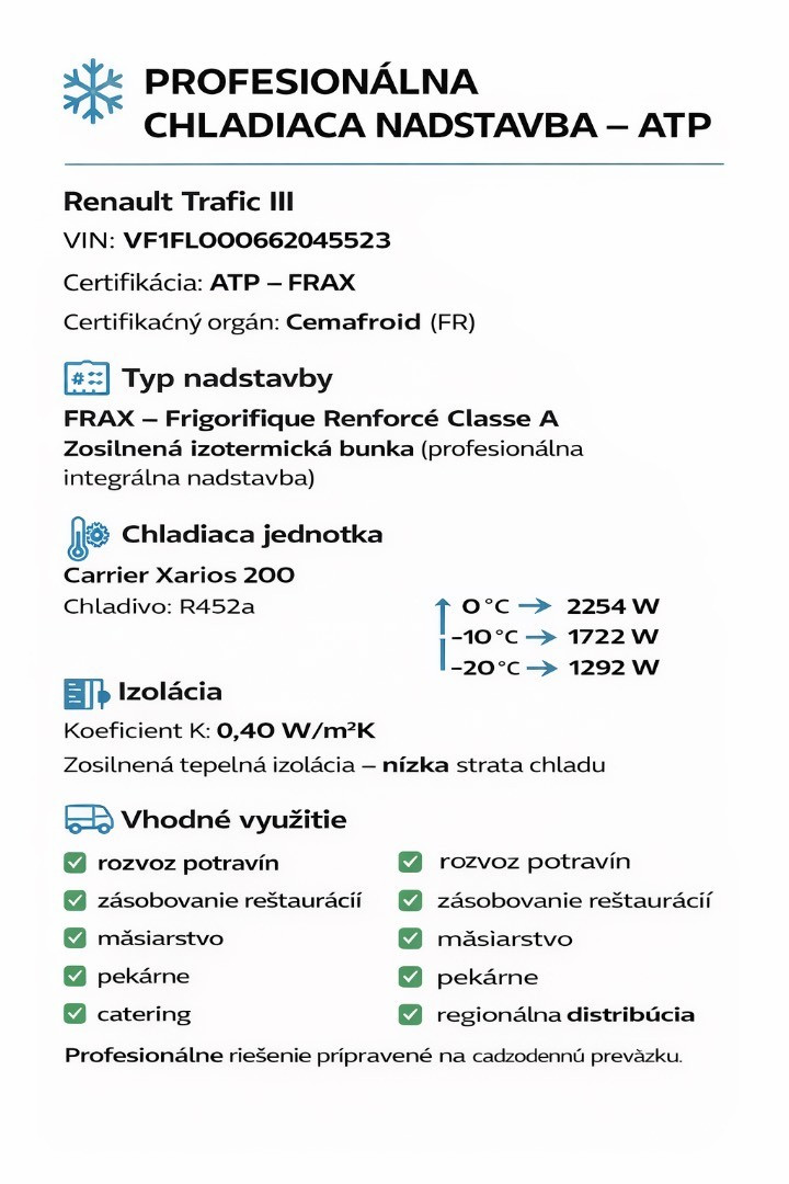 Renault Trafic L2H1 FRIGO – mraziarenská dodávka vo výnimočne peknom stave. Spoľahlivý a úsporný motor 1.6 dCi s manuálnou 6-stupňovou prevodovkou. Motor má kultivovaný chod, pekný ťah a veľmi dobrú dynamiku aj pri plnom zaťažení. Jazdí presne tak, ako má jazdiť zdravý Trafic. Vozidlo pochádza z južného Francúzska – karoséria je zachovalá, bez typickej zimnej korózie. Celkovo pôsobí veľmi slušne po vizuálnej aj technickej stránke. Plnohodnotná mraziarenská prestavba – FRIGO. Profesionálna izotermická nástavba s certifikátom, nie dodatočne upravované riešenie. Ideálne pre rozvoz potravín, mäsa, cukrárenských výrobkov, gastro prevádzky alebo farmaceutický segment. Auto je pripravené okamžite do prevádzky. Slovenské doklady, nová STK a EK. Možnosť odpočtu DPH. Okamžite k odberu. Takéto mraziarenské vozidlá sa na trhu objavujú zriedka, najmä v takomto stave. Ak hľadáte spoľahlivý pracovný nástroj bez ďalších investícií, toto je veľmi silná ponuka.