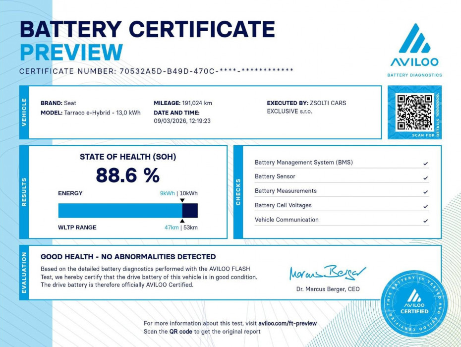Seat Tarraco FR eHybrid – prakticky maximálna výbava, výnimočný stav. Auto je bez jediného škrabanca, nikdy nebolo lakované a pôsobí mimoriadne zachovalo – vyzerá skôr ako auto s nájazdom okolo 30 000 km. Batéria je vo výbornom stave, s kapacitou približne 90 %, čo potvrdzuje aj certifikát. Je vidieť, že sa o auto starali. Prednedávnom bol urobený kompletný servis, takže vozidlo je bez akýchkoľvek investícií. Auto sme vykúpili od pôvodného majiteľa, ktorý jazdil najmä dlhé diaľničné kilometre a prešiel na dieselové kombi. Veľká výhoda plug-in hybridu je každodenné jazdenie na elektrinu. Pri domácom nabíjaní stojí plné nabitie približne 1,7–2 € a reálny elektrický dojazd je približne 40–45 km. Ak napríklad dochádzate do práce 30 km tam a 30 km späť, väčšinu pracovných dní prejdete na elektrinu a denná cesta vás vyjde približne 2–3 €. Ideálne auto pre niekoho, kto jazdí denne do práce, vie nabíjať doma alebo vo firme a chce jazdiť veľké SUV s minimálnymi nákladmi. Kompletne preverené vozidlo, veľmi pekný kus so super dizajnom, bohatou výbavou a výbornou cenou. Najdrahšia časť elektromobilu je batéria – preto k tomuto vozidlu od nás dostanete profesionálny EU certifikát jej zdravia (SOH), takže kupujete auto s overenou batériou, nie riziko.